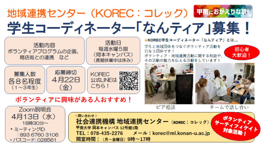 「地域連携センター学生コーディネーター」(以下、学生コーディネーター)とは、甲南大学地域連携センター(KOREC;コレック)の教職員と協力しながら、学生の皆さんと地域団体とをつなぐ学生ボランティアです。学生のみなさんと同じ目線に立って、ボランティア?地域連携活動に関する相談に応じたり、ボランティア?地域連携活動の魅力を伝える様々な企画運営や情報発信をします。地域連携やボランティアコーディネーション等について研修で学びながら、大学と地域をつなぐ多様な活動に取り組みます。